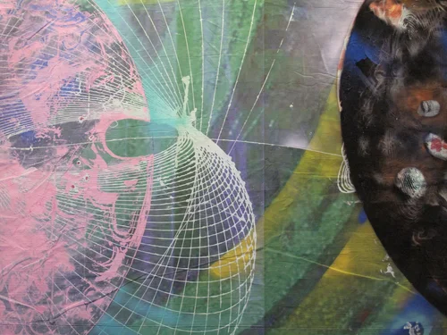 This is a work inspired by the research being done at CERN, Switzerland. Mixed media on paper, 32"x36"