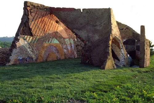 This is made of earth cast cement with a colored veneer of white cement and plaster with pigments. The pigmented walls differentiate an interior and exterior. The walls are solid cast. These works are designed to weather away over a period of years back into the ground from which they came.