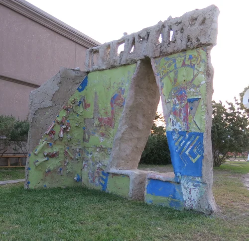This sculpture is made of stabilized earth 11' x 12' x 5' Located on the grounds of The Brownsville Museum of Fine Art just seven blocks North of the border. Built with help from students and community members. Image is inspired by the "House of the Governor" at Uxmal, Yucatan Mexico it symbolizes hope for free open passage with our neighbors to the South. 2017