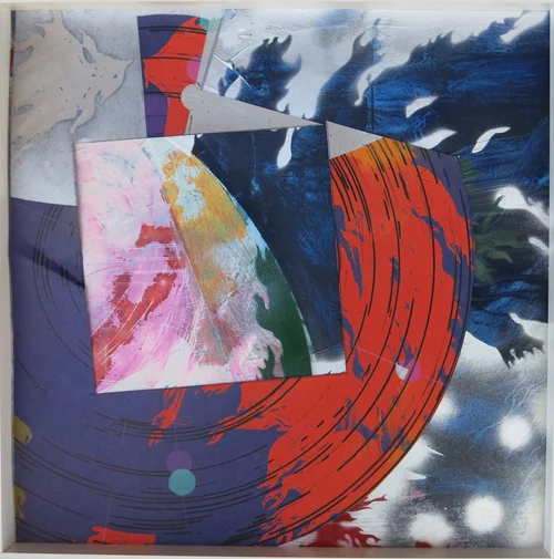This series is inspired by the work being done with the Large Hadron Particle Collider in Cern Switzerland. I begin with a digital print on canvas and paint back onto print to achieve a push pull between illusion and surface.